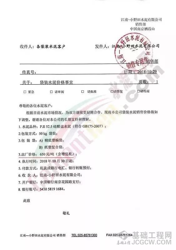 10月30日,江南-小野田水泥有限公司销售部中国南京栖霞山厂发出水泥调价通知称:根据目前水泥市场情况,为双方继续更好的合作,将公司袋装水泥销售价格上调。上调之后执行价高达650元/吨。