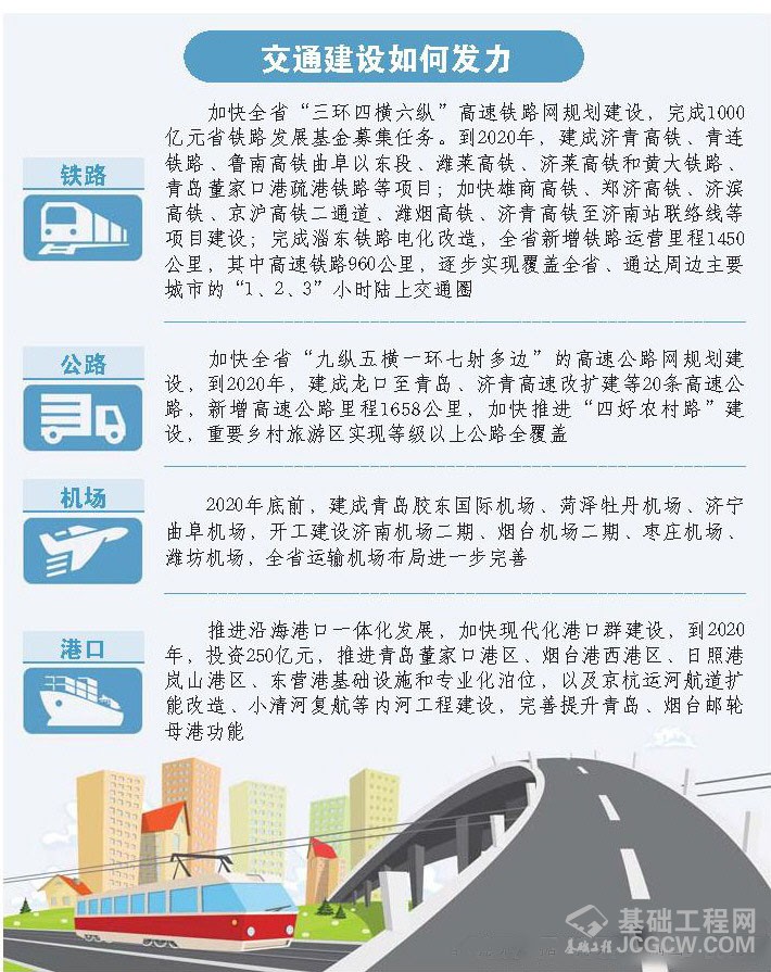高速公路曾是山东的名片,但近年来发展却相对落后。紧随铁路之后,《意见》对公路建设提出具体要求,加快全省“九纵五横一环七射多边”的高速公路网规划建设,到2020年,建成龙口至青岛、济青高速改扩建等20条高速公路,新增高速公路里程1658公里。