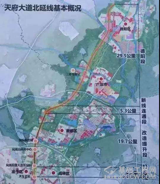 天府大道北延线南起成都二环路北段,北至德阳青衣江路,全长58.5公里,其中成都段29公里,德阳段29.5公里,串接“四区一市”,即成都金牛区、成华区、新都区和德阳市旌阳区、广汉市。