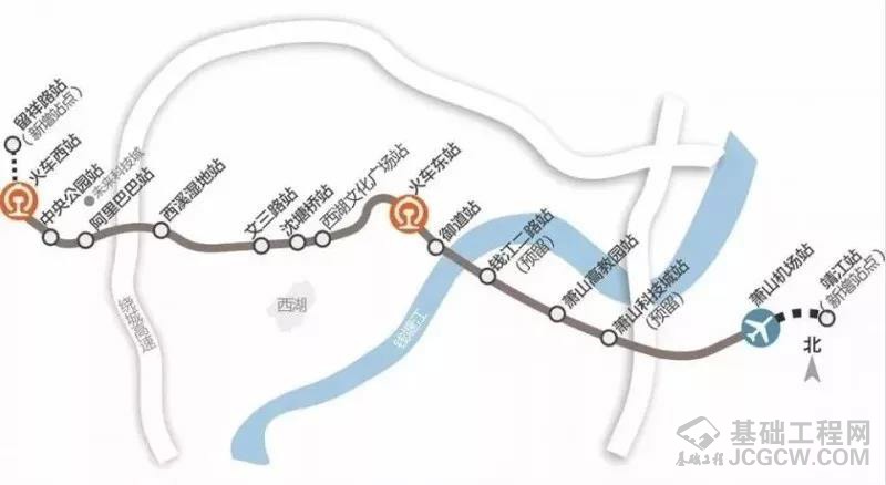 机场轨道快线全长57公里,沿途串连起杭州西站、杭州东站、杭州机场三大交通枢纽,设阿里巴巴站、西溪湿地站、西湖文化广场站等15个站(地下车站11座,高架车站4座),可以和地铁1号线、2号线、6号线、10号线等12条地铁线换乘。