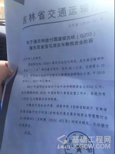 许先生向记者出示了一份吉林省交通运输厅发给四平市的《请尽快拨付国道绥沈线服先至金宝屯项目车购税资金的函》,文件中,吉林省交通厅向四平市政府表明,绥沈国道是吉林省十三五重点项目,总投资6.16亿元,其中2017年,该项目安排并下达了中央车购税资金3.8752亿元,在2018年国务院大督查自查工作中,发现仍有1.9752亿元滞留在四平市财政。在函件中,吉林省交通厅要求四平市,尽快拨付这笔资金。