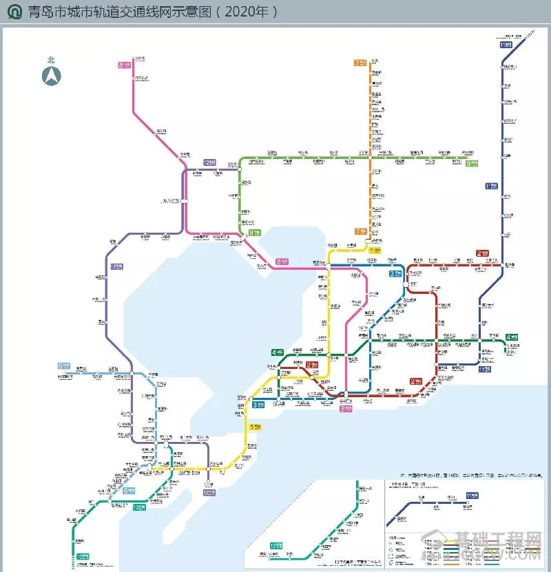 青岛市轨道交通2020年线网全长约470.4km,由11条轨道交通线路组成:主要包括1号线(41.6km)、2号线一期+东延(泰山路—世园会段,34.4km)、3号线全线(24.8km)、4号线一期(人民会堂—沙子口段,26.6km)、6号线一期(朝阳山—中韩园区段,33.1km)、7号线一期+北延(兴国路—北安段,27.9km)、8号线(60.9km)、9号线一期(红岛—惜福镇段,35.9km)、11号线一期(苗岭路—王村新城段,58.4km)、12号线(56.5km)、13号线(70.3km)。