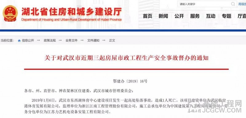 2019年1月6日,武汉市东西湖体育中心建设项目发生一起高处坠落事故,造成1人死亡。该项目建设单位为武汉临空港体育发展有限公司,监理单位为浙江江南工程管理股份有限公司,施工总承包单位为中国建筑第八工程局有限公司,劳务分包单位为江苏力艺机电设备安装工程有限公司。