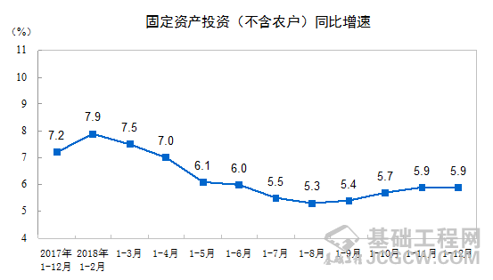 2018年全国固定资产投资(不含农户)635636亿元,比上年增长5.9%,增速比前三季度加快0.5个百分点。其中,民间投资394051亿元,增长8.7%,比上年加快2.7个百分点。分产业看,第一产业投资增长12.9%,比上年加快1.1个百分点;第二产业投资增长6.2%,加快3.0个百分点,其中制造业投资增长9.5%,加快4.7个百分点;第三产业投资增长5.5%,其中基础设施投资增长3.8%。