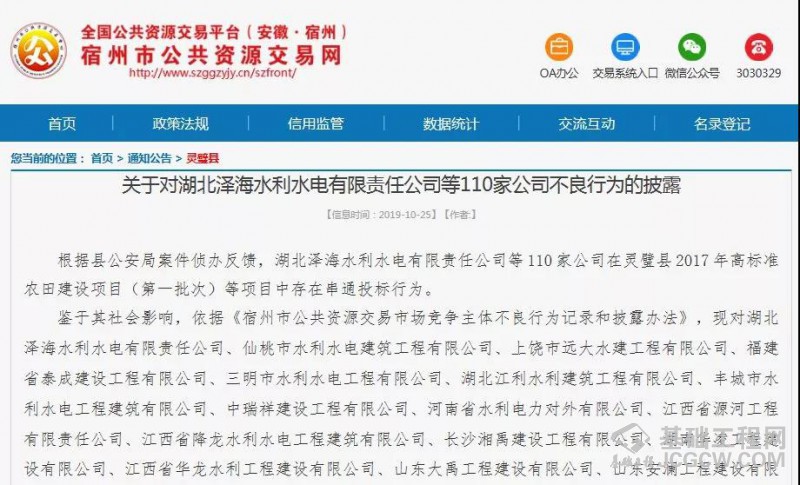 核心提示: 近日,安徽省宿州市公共资源交易网披露一起串通投标案。根据县公安局案件侦办反馈,110家公司在灵璧县2017年高标准农田建设项