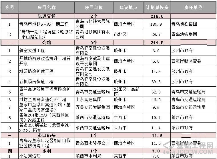 核心提示: 青岛发布2020年重大基础设施建设计划 一、轨道交通方面: 建设地铁6号线一期、2号线一期西延工程2个项目,总投资219亿