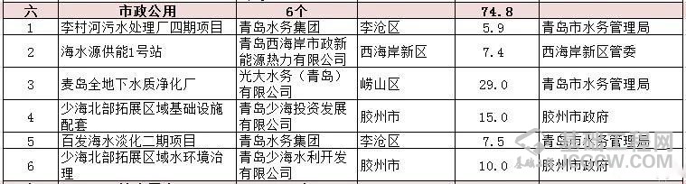 建设李村河污水处理厂四期、百发海水淡化二期等6个项目,总投资75亿元。