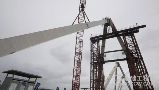 一根40多米长的白色桥梁斜撑被缓缓吊起,在被吊装至规定位置以后,施工人员随即对其进行焊接固定。