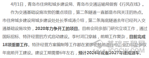 青岛市住房和城乡建设局城乡建设处处长季成涛透露,第二条海底隧道力争2020年年底开工建设,由于地质条件特殊复杂施工安全的难点比较大,建设工期需要6年左右,预计2026年或者2027年建成通车。