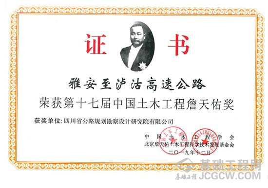 近日,中国土木工程学会公布了第十七届中国土木工程詹天佑奖获奖名单,四川省公路规划勘察设计研究院有限公司牵头设计的雅安至泸沽高速公路获此殊荣,这是该公司第9次捧起詹天佑奖杯。该项目又称雅西高速,全长240公里,是国家勘察设计和科技双示范工程。