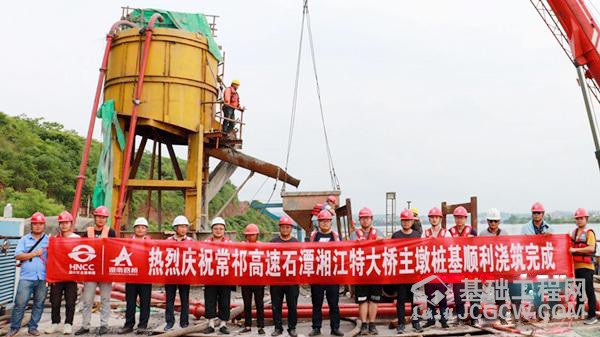 5月17日下午,常祁高速公路控制性工程石潭湘江特大桥最后一根直径3.6米、桩长58.5米、桩基钢筋笼92吨、钻孔深度67米、嵌入岩层46米的主墩桩基浇筑顺利完成。至此,常祁高速公路石潭湘江特大桥16根直径3.6m水中桩基础施工已全部完成,后续水上施工即将全面展开。