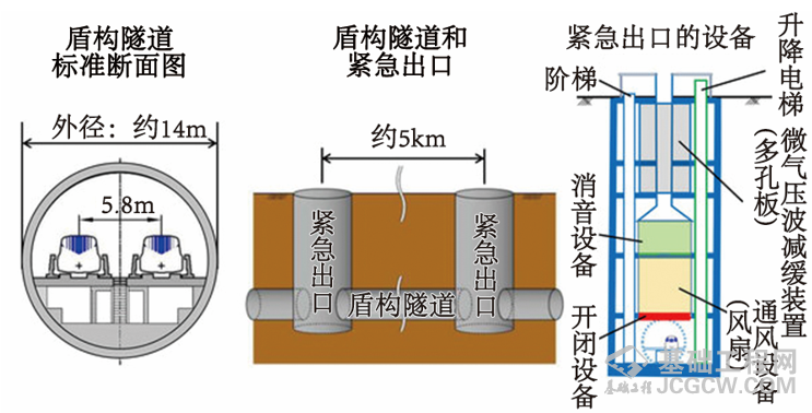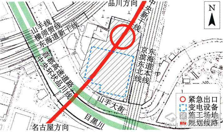 通常,在地铁建设中,盾构的始发井多设置在车站明挖区间的一端。但在中央新干线中,由于品川站是在现有的东海道新干线车站正下方修建,将盾构始发井一并设置在该车站处并不现实,盾构始发后到下一个竖井也还要推进较长的距离。因此,北品川紧急出口设在了距品川站约1km处,东西两侧被东海道本线和东海道新干线这两条线路所包夹。