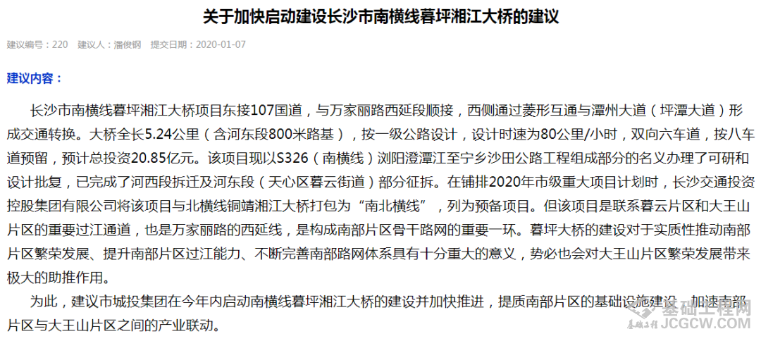 有关于南横线暮坪湘江大桥项目一直都是备受关注的,近日,长沙城发集团在长沙市十五届人大五次会议第220号建议相关回复文件中表明确保暮坪湘江特大桥项目今年12月份开工,计划于2024年6月完工。