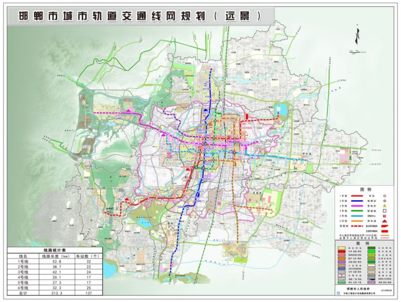 邯郸市城市轨道交通线网(远景)由6条线路组成,总长度213.3公里。