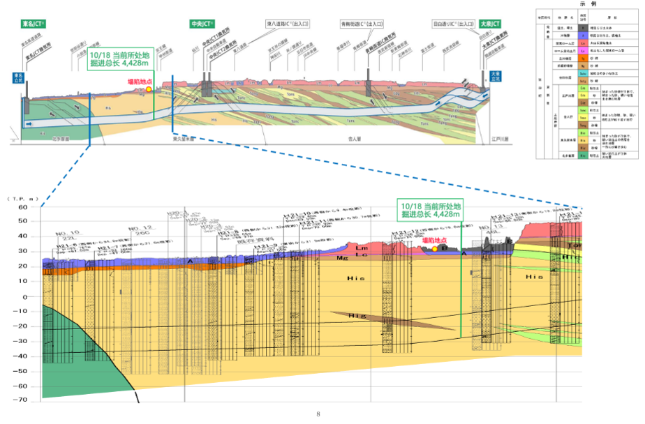 本次塌陷事故的发生地就位于该主线隧道(南行)东名北工程的正上方,该区间由东日本高速道路公司负责,连接关越车辆道路至东名高速道路路段,隧道全长9.2km,外径15.8m,内径14.5m,衬砌厚度650mm,目前,盾构机掘进到了塌陷处(南侧)约700m的位置,东日本高速道路公司已暂停隧道施工。