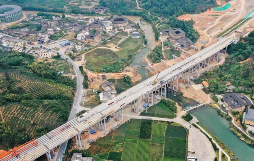 11月3日,随着最后一片T梁架设完成,漳(州)武(平)高速公路南靖段A4标段田中赋大桥全幅贯通。