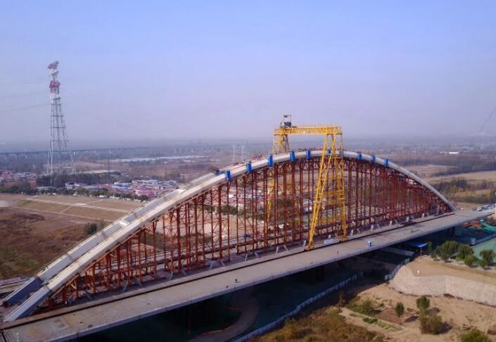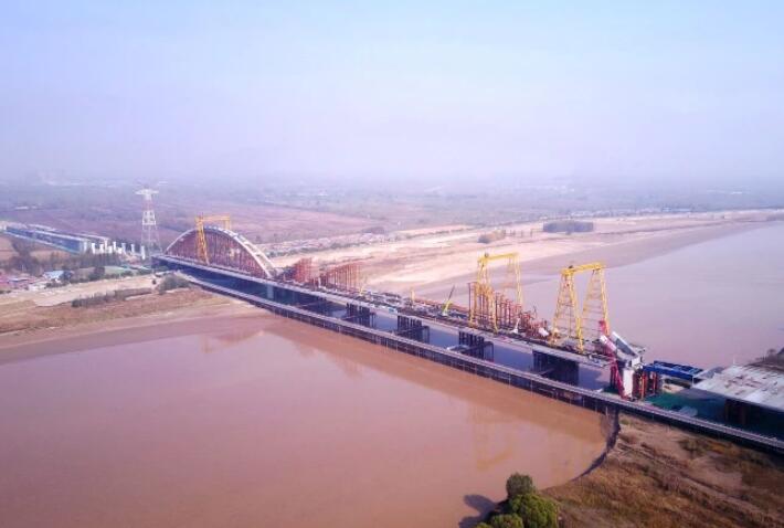 齐鲁黄河大桥的主跨420米钢拱肋采用三段法安装,两侧梁桩各60米,采用满堂支架法拼装到位。中间段300米先在钢箱梁上卧拼,卧拼安装完成后,在安装中段拱肋的提升塔架、对拉钢绞线等工装系统。然后通过龙门吊将中心段钢拱肋整体提升到位后完成钢拱肋的安装。提升段长度达到300米,提升高度达27米,提升重量达6500吨,在桥梁界同时创提升重量、提升跨径的世界之最。