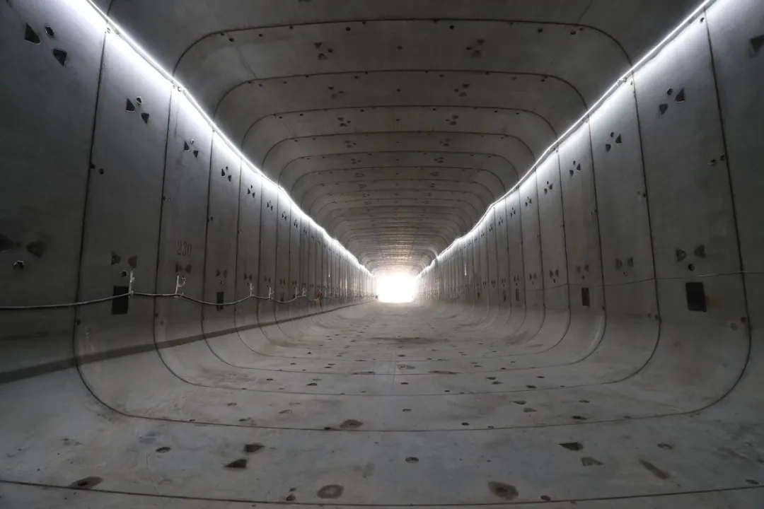 此次贯通的“北隧”部分段,采用超大断面矩形顶管机“宝山先锋号”分东西双线顶进完成。“宝山先锋号”是个“超大家伙”,单线顶管断面尺寸9.90米×8.15米,一次顶进距离445米,管顶平均覆土深度不足4米,也创造了目前世界一次顶进距离最长超大断面超浅覆土矩形顶管记录。自2019年10月28日东线顶管始发以来,历时近390个日夜,顺利实现双线贯通。目前,东西线正在进行地道明挖暗埋段及敞开段结构施工,东线顶管内已经开始电缆桥架安装,地下通道雏形初现。