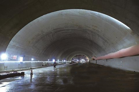 421.73平方米究竟有多大?相当于一个标准篮球场的大小。据介绍,山体内立交交通体系导致蔡尖尾山2号隧道开挖宽度分四次加宽至最大30.51米,开挖面积分四次扩大到421.73平方米,成为目前国内在建最大的隧道断面。”