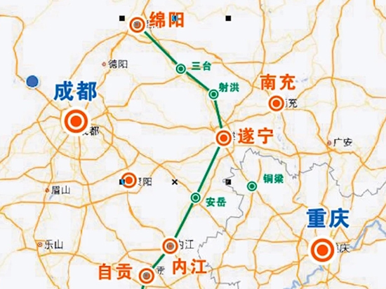 第4条是绵遂内城际铁路,线路起于成兰铁路安州站,经绵阳,遂宁市,资阳市安岳县至内江市,自贡市,宜宾市。其中内江--自贡--宜宾段的内自宜城际铁路已于2018年开工建设,待建的是绵阳至遂宁至内江段。建成后将结束绵阳安州区、三台县,遂宁射洪市、安居区,资阳安岳县不通铁路的历史。