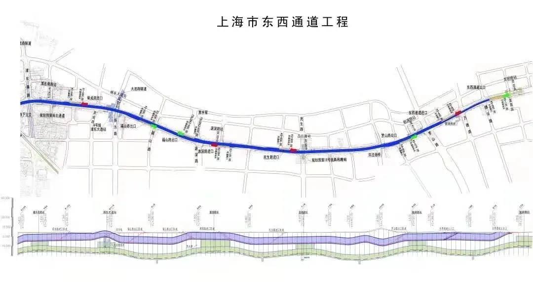 东西通道工程西起延安东路隧道浦东出口,东至金桥路,全长7.8公里。其中,隧道口至龙居路段由主线地下通道加地面道路组成,全长6.1公里,地下通道按双向4-6车道规模建设,下方为地铁14号线的6站6区间;龙居路至金桥路为地面道路,全长约1.7公里,按双向8车道规模建设,全线共设置11个进出口匝道。