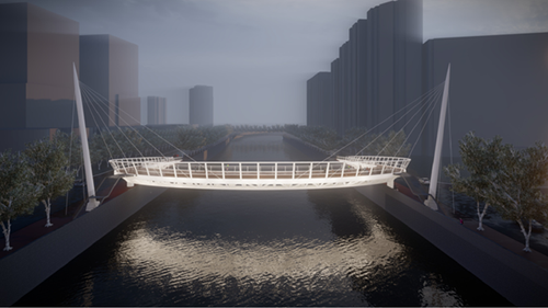 安远路跨苏州河桥效果图 据介绍,该桥梁为人行桥梁,兼顾非机动车推行。工程将新建跨苏州河C型主桥、坡道和梯道,以及工程范围内的西苏州路和光复路道路修复。主桥桥梁采用3跨钢桁架连续梁结构+辅助双塔拉索,实现一跨过河、水中不设墩,计划于2022年9月建成通行。 安远路跨苏州河桥对苏州河中心城段滨水贯通、“一江一河”慢行空间网络化目标实现具有重要作用。桥梁建成后,将进一步改善区域内行人及非机动车通行条件,进一步完善区域内跨苏州河桥梁布局,进一步促进周边区域土地开发并带动城市经济发展。