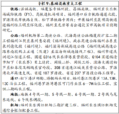 加快建设联通宁德、莆田、泉州、温州、南昌及通向机场、港口等区域的干线,积极谋划昌福、广福、温福高铁,建设国家东南区域铁路枢纽。建成轨道交通4号线一期、5号线一期、6号线一期、2号线马尾东延线,启动6号线东调段建设。建成城际铁路F1线,加快推进城际铁路F2、F3线建设。有序推进福州轨道交通第三期建设规划,在完善中心城区轨道交通线网的基础上,力争辐射周边青口汽车城、南屿、南通、闽侯县城、连江琯头和贵安等重要城市组团,形成环线+放射状的轨道交通网络。