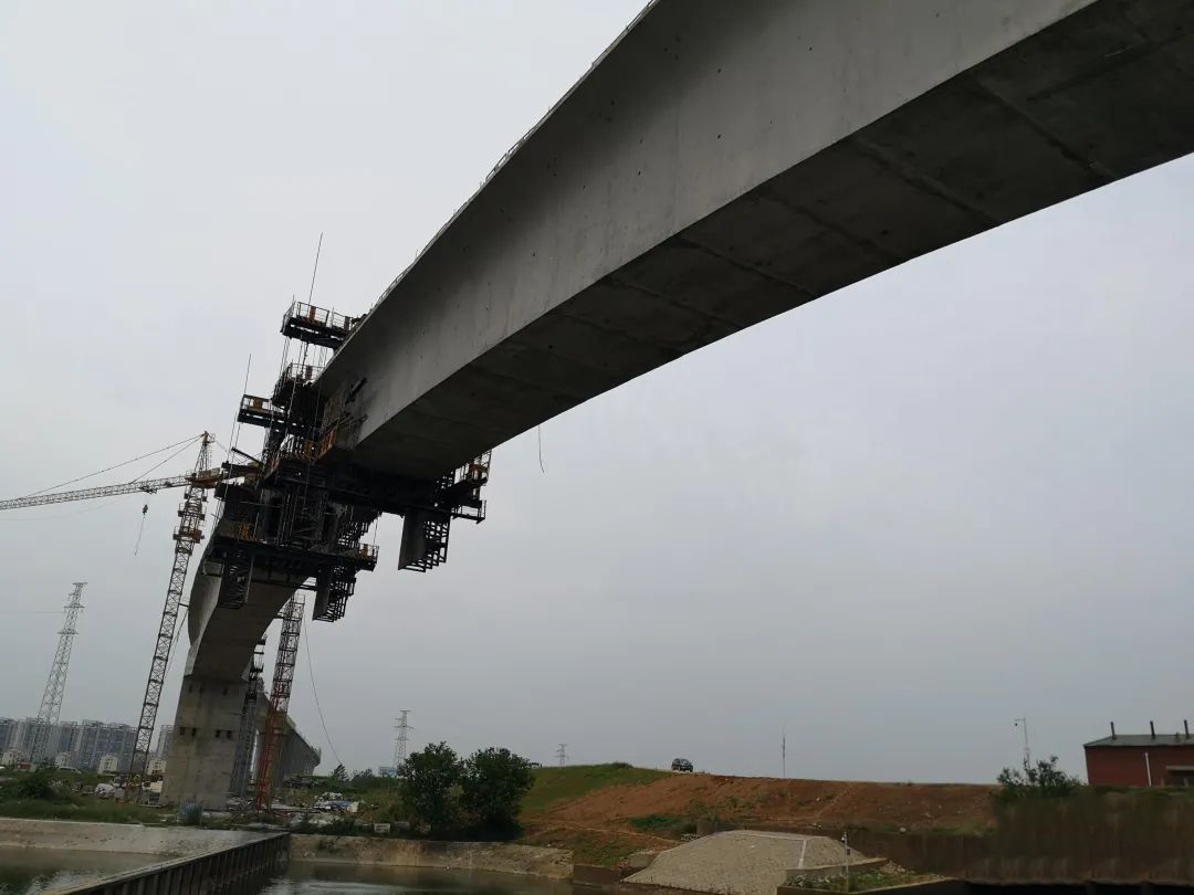 靠东荆河大堤的这一段连续梁,肉眼可见仅剩下一小段的梁体未浇筑,两个端头的挂篮施工设备即将实现“牵手”。从下往上看,可清楚见到这段连续梁并非直线,而是呈现一定弧度的“S”型。