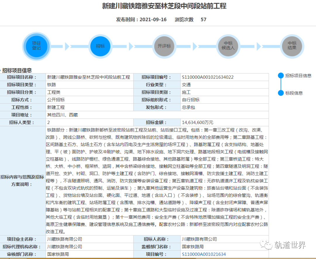 9月16日,新建川藏铁路雅安至林芝段中间段站前工程17个标段施工招标公告公布,涉及金额超过1463亿。