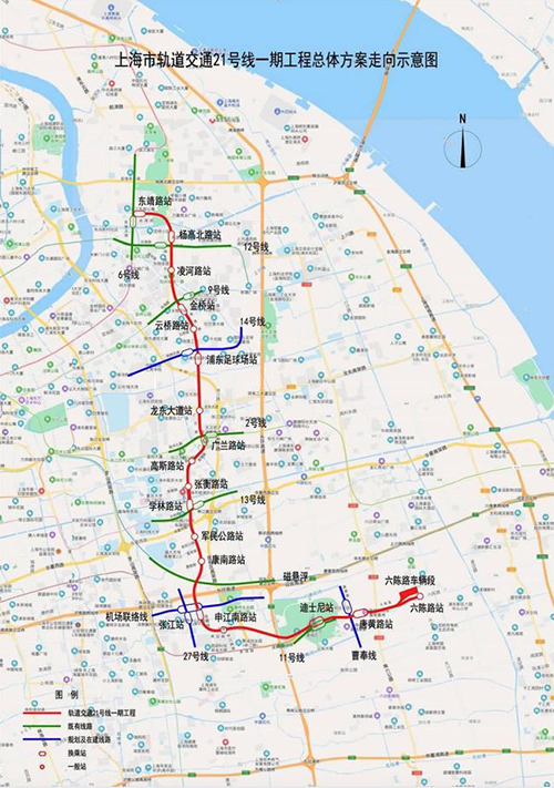 轨道交通21号线是一条贯穿浦东新区至宝山吴淞的南北向径向市区线。一期工程线路起于国际旅游度假区东侧的六陈路站,终于浦东高行的东靖路站,均位于浦东新区范围内,两端预留延伸条件。线路串联了国际旅游度假区、张江科学城及张江副中心、金桥出口加工区及金桥副中心等功能区,近、远期向东联系浦东综合交通枢纽,向北联系外高桥、吴淞。项目建设有助于形成浦东中部发展轴线,强化功能区南北向联系;构建浦东新区南北向干线通道,充分衔接既有地铁网络,可与众多东西向市区线干线换乘;提升浦东新区线网密度,均衡网络客流,缓解既有6号线北段客流拥堵,缓解南北向交通拥堵状况;提高国际旅游度假区游客到发便利性,支持张江科学城、金桥出口加工区发展,服务浦东北路等客流走廊。