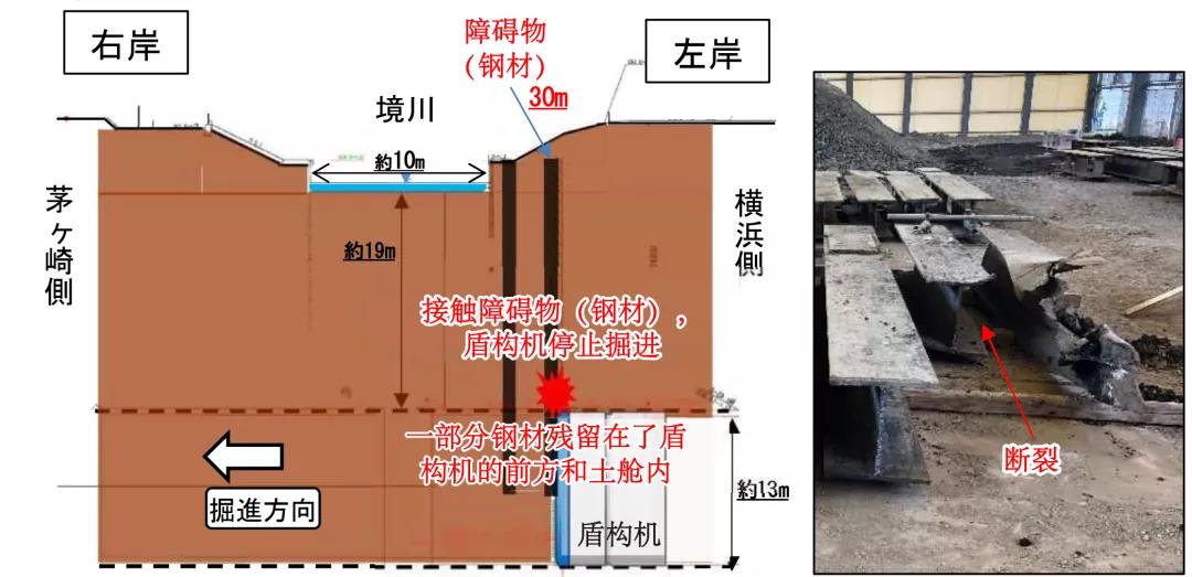 在始发掘进400m后就发生了故障,无法继续掘进。经调查发现,盾构停机区域位于境川的堤坝下,该处埋有多根宽40cm、长30m的H型钢,据判断应是建造某个临时构造物时留下的桩基。由于施工前并未查到有此桩基的登记记录,因此未能事先预知。