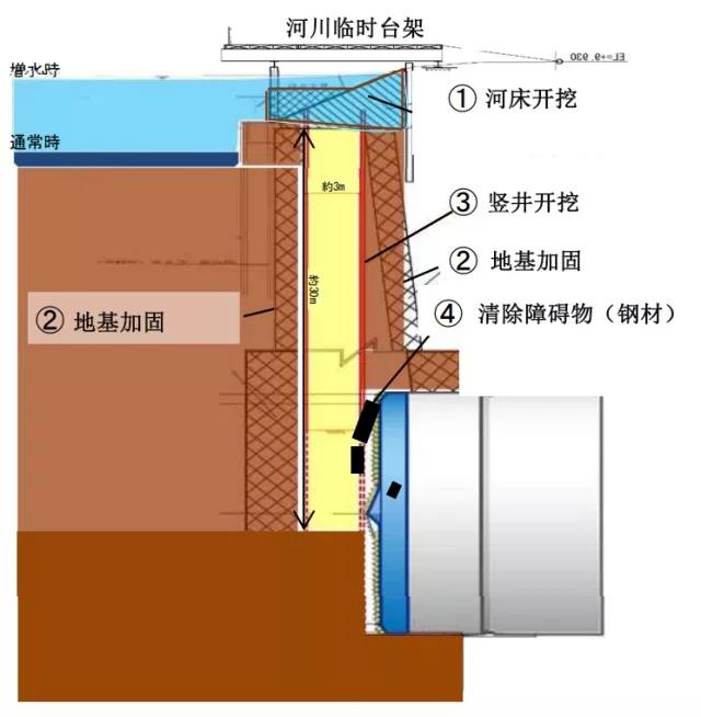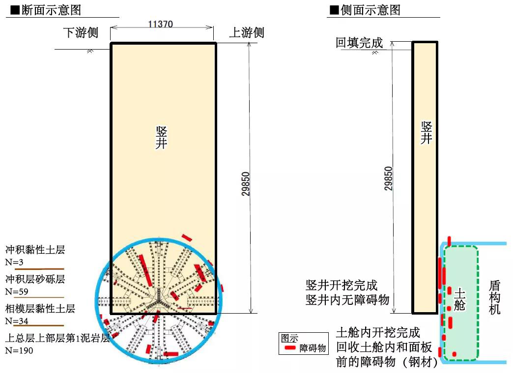 1)在盾构前方设置一个深30m的竖井,用以清除剩余的障碍物(钢材),并确认盾构机刀盘前没有障碍物残留。