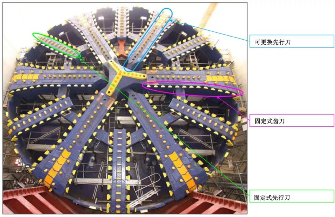 3)从竖井内检查盾构机的前部刀盘时,发现多个刀头已有磨损、缺损和脱落的现象。因此进行了部分刀具的替换:①更换已损坏的可更换先行刀(负责挖掘土体);②固定式齿刀、固定式先行刀虽然有所损坏,但可以工作,因此待二次检查后再行更换。