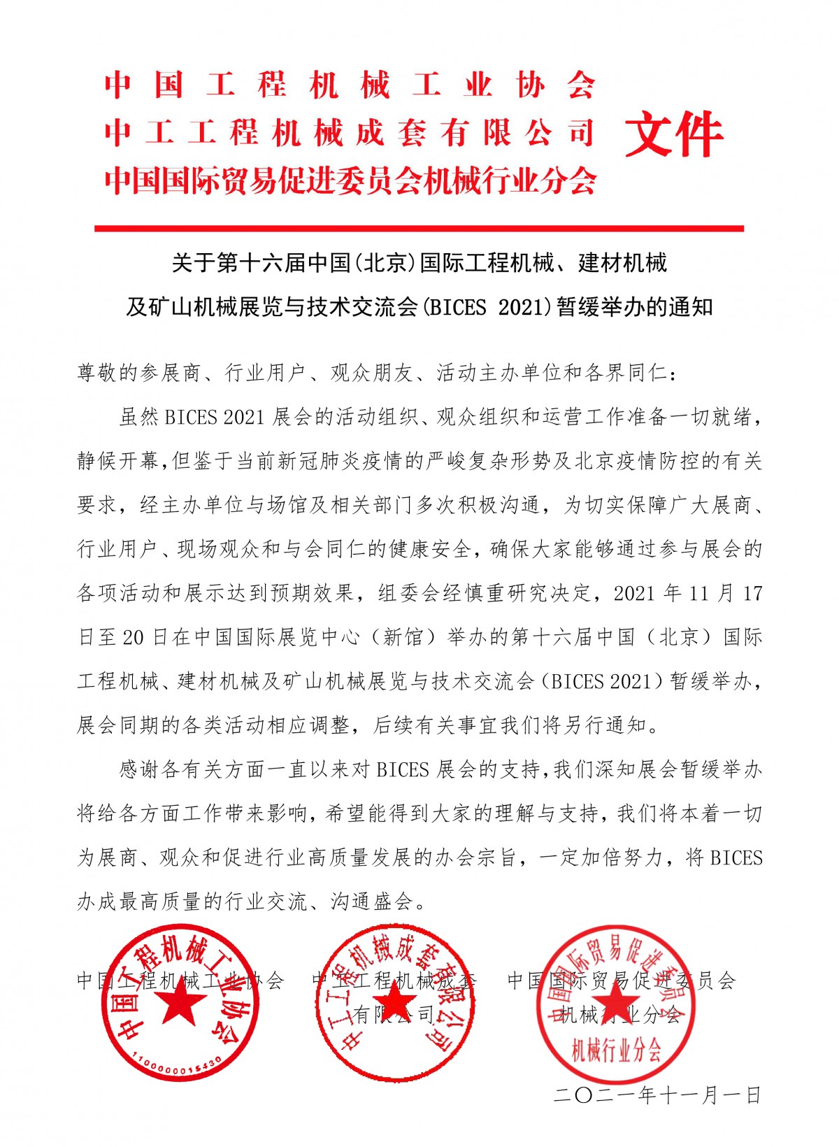 近日,国内新冠肺炎疫情呈多点散发,疫情已涉及16省、自治区、直辖市。北京市已有多名确诊病例及无症状感染者,北京西城、海淀、昌平、丰台等多个区域暂停电影放映等聚集性活动。为严格落实“外防输入,内防反弹”的防控策略,有效控制和降低疫情传播风险,保障广大展商、行业用户、现场观众和与会同仁的健康安全。BICES 2021组委会于今日下发了关于第十六届中国(北京)国际工程机械、建材机械及矿山机械展览与技术交流会(BICES 2021)暂缓举办的通知,延期时间未定。具体通知如下: