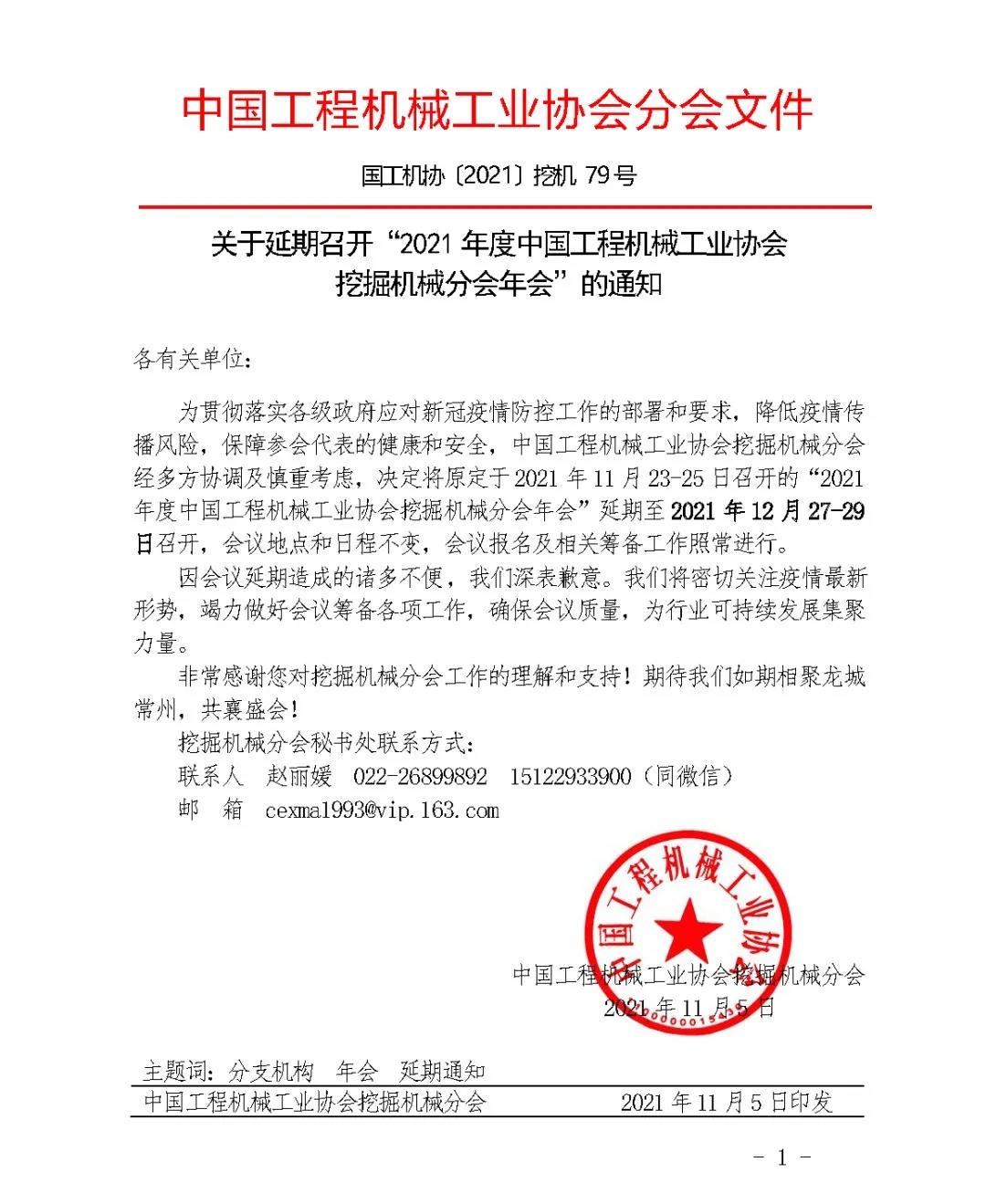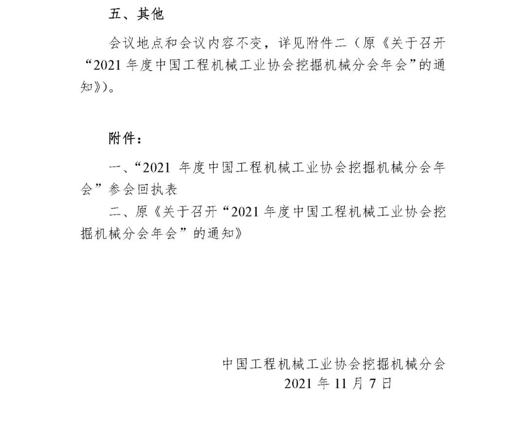 关于延期召开“2021年度挖掘机械分会年会”的通知