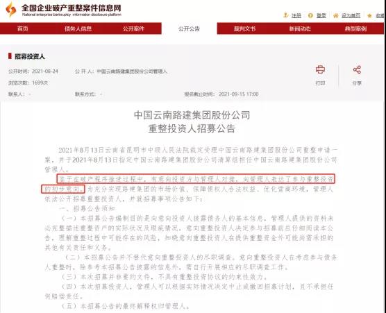 前段时间,中国云南路建集团股份公司申请破产重整。