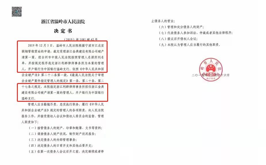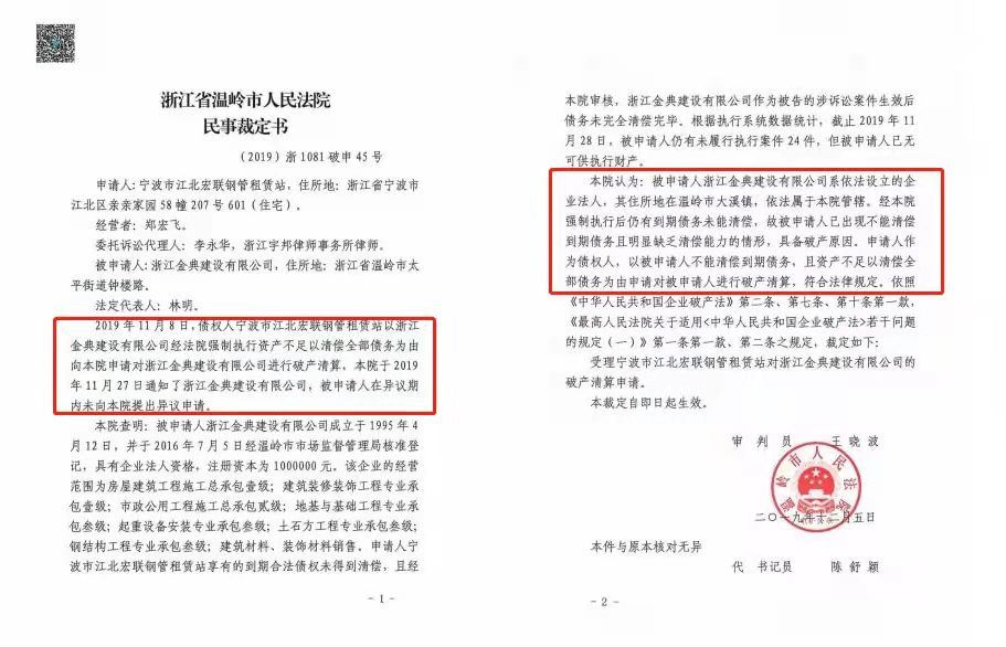 2019年11月8日,债权人宁波市江北宏联钢管租赁站以浙江金典建设有限公司经法院强制执行资产不足以清偿全部债务为由向浙江省温岭市人民法院申请对浙江金典建设有限公司进行破产清算。