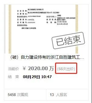 ▲2021年7月24日,浙江自胜建筑工程有限公司(建筑工程一级资质)申请破产清算,并于8月28日在网络平台上进行第一次公开拍卖。