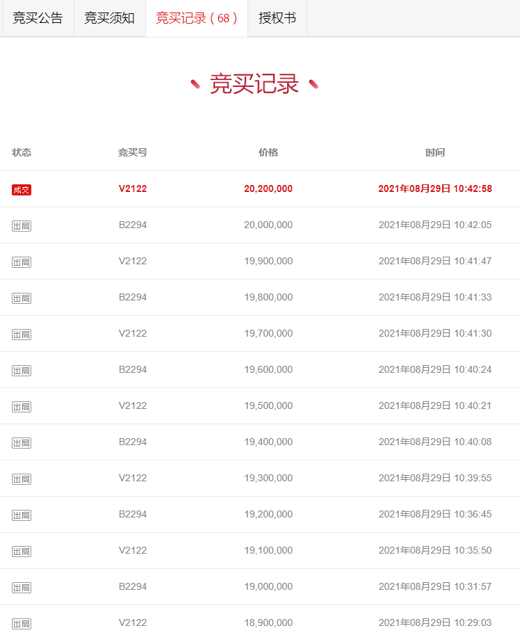 8月28日,在淘宝网司法拍卖网络平台上进行第一次公开拍卖,最终经过68轮的竟卖出价,最终以2020万元的高价成交。