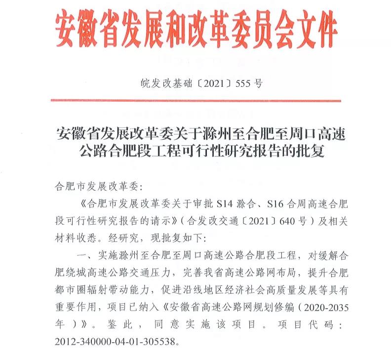 滁州至合肥至周口高速公路合肥段已列入《安徽省高速公路网规划修编(2020-2035年)》,路线长约85.81公里,途径合肥市肥东县、长丰县,为规划S14滁州至合肥高速及S16合肥至周口高速的重要组成部分。