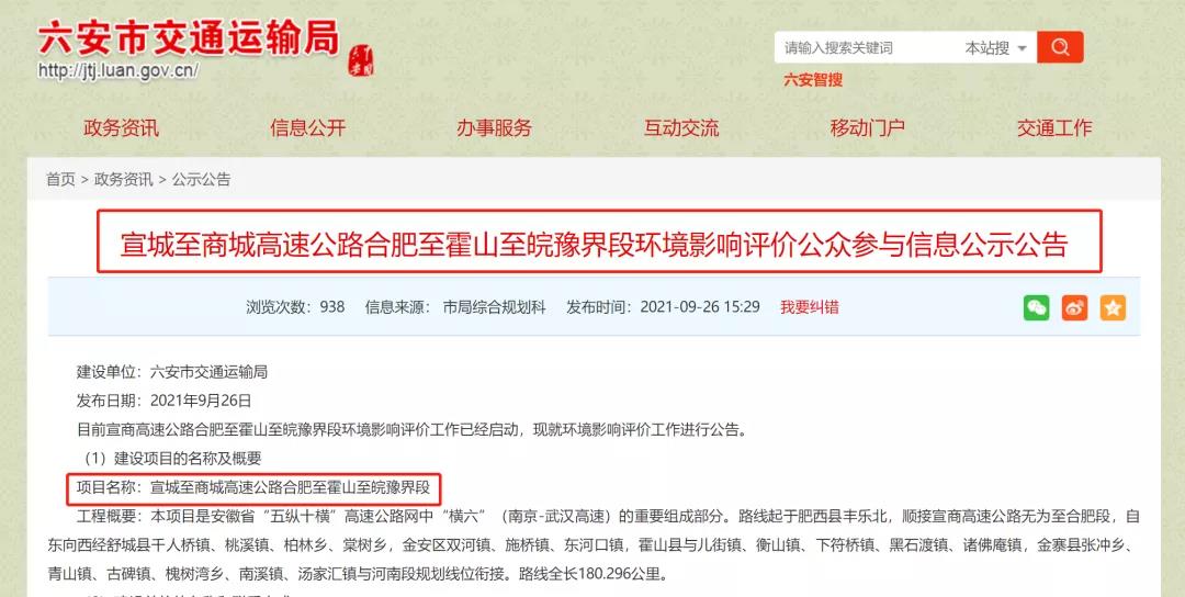 项目动态:2021年10月,六安市交通局发布了宣城至商城高速公路合肥至霍山至皖豫界段环境影响评价公众参与信息公示公告,其中公布了宣商高速在六安段的线路走向,意味着项目有了重大进展。