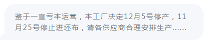 近日,某纺织厂发布通知表示:受各种因素影响,工厂一直亏本运营,决定于12月5日停产放假,直接停工到明年3月份!