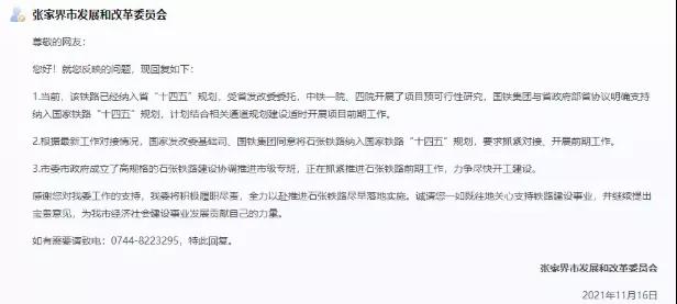 11月16日,张家界市发改委在回复网友留言关于石门至张家界高铁进展情况时答复:
