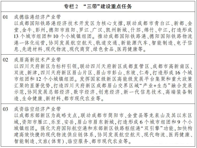 沿成渝地区北中南三条发展轴线,依托高铁高速通道,深化与川南经济区、川东北经济区城市的协同发展,积极推进与重庆主城区及渝西、渝东北合作。沿长江黄金水道,与长江中游重点城市开展供应链、产业链协作,主动承接长三角产业转移并强化合作互动,延伸拓展与东北亚和美洲地区的国际经贸合作。