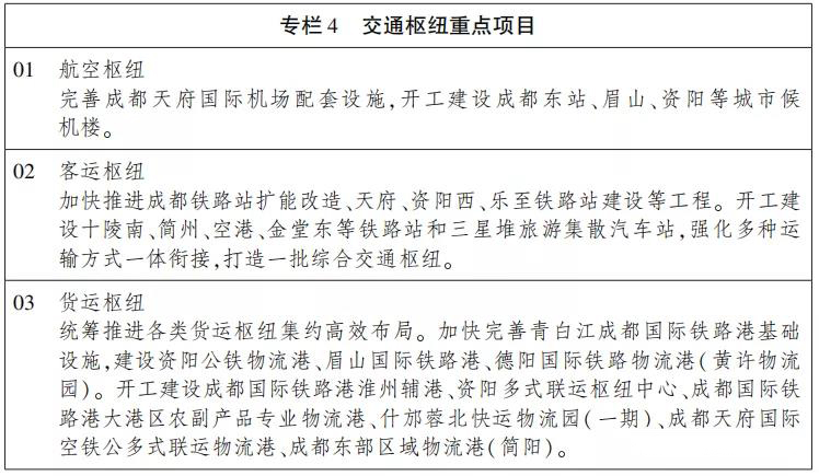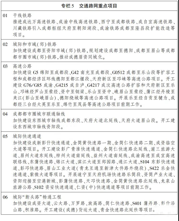 完善都市圈东西城市轴线,建设成资大道和市域(郊)铁路,推动成都东进和重庆西扩相向发展,强化成都东部新区与重庆联动的重要支点作用,夯实成渝发展主轴。加快建设天府大道北延线,畅通天府大道眉山段,推动南北向市域( 郊) 铁路有序发展,强化四川天府新区、成都国际铁路港经济技术开发区的辐射带动作用,打造成德眉发展轴。