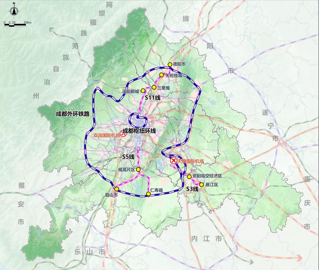 成都都市圈“两环三射”轨道交通骨架示意图