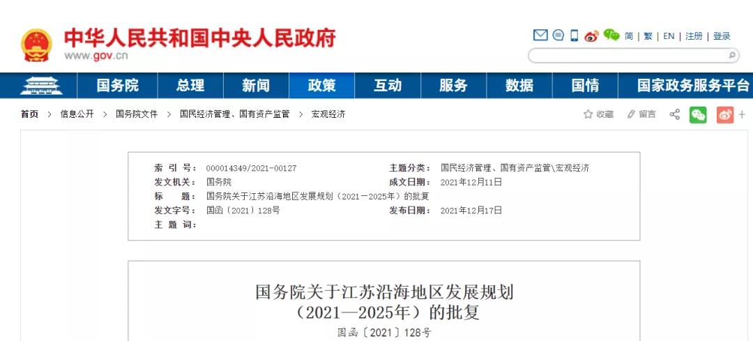 近日,国务院下发通知,批复同意《江苏沿海地区发展规划(2021—2025年)》(以下简称“规划”)。《规划》着力推动江苏沿海地区经济高质量发展,着力塑造滨海城乡特色风貌,着力夯实绿色发展生态本底,着力完善现代基础设施体系,着力培育双向开放新优势,不断提高区域综合实力、竞争力和带动力,积极融入共建“一带一路”和长江经济带发展,在长三角一体化进程中拓展新空间、展现新作为。具体如下: