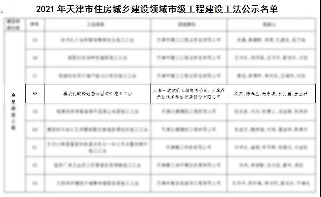 基础工程网、《基础工程》杂志社讯 近日,天津市住房和城乡建设委员会公布了2021年天津市市级工程建设工法的名单,由天津鼎元软地基科技发展股份有限公司、天津三建建筑工程有限公司共同申报的《模块化软弱地基加固构件施工工法》荣获房屋建筑工程类市级新工法殊荣。