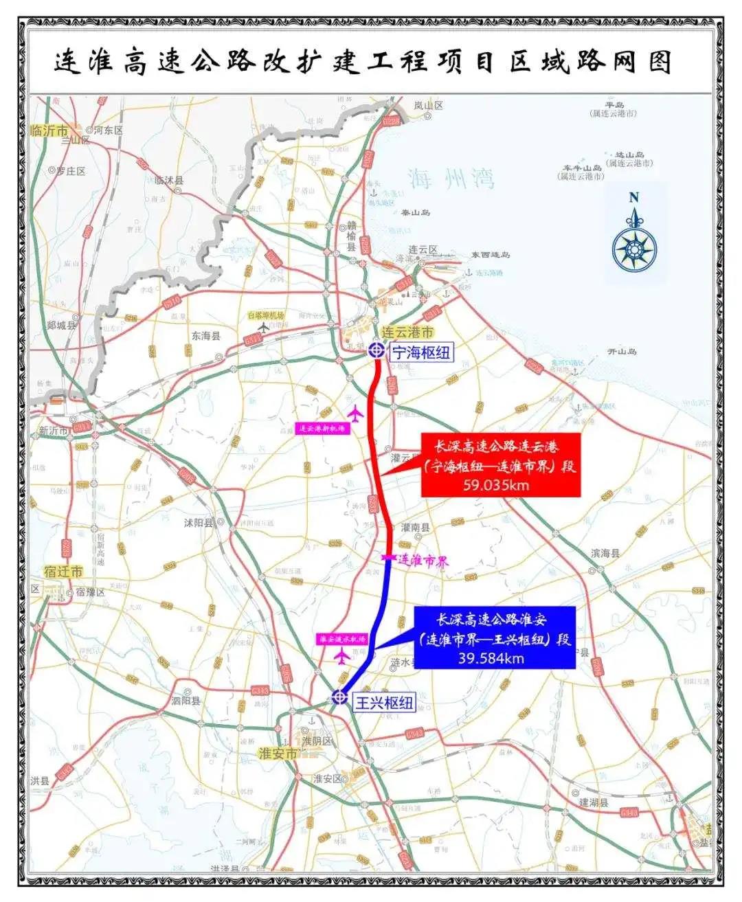长深高速公路扩建工程连云港段,起自连云港市海州区宁海枢纽北,经海州区、灌云县、灌南县,止于灌南县与淮安市涟水县交界处,全长约59.02公里。全线由双向四车道扩建为双向八车道,设计时速120公里。