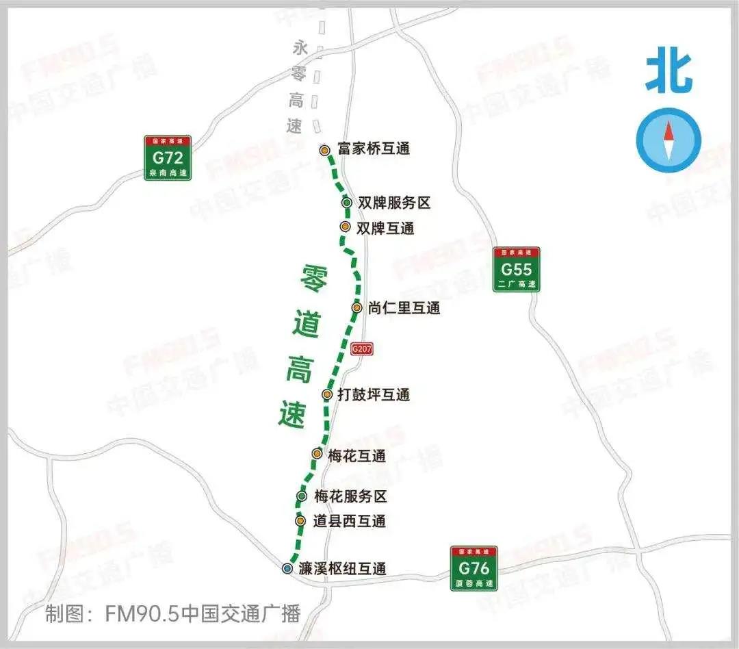 零道高速公路位于湖南省永州市南部,起于富家桥镇,与在建的永零高速对接,途经零陵区、双牌县,终于道县鸟梨树村,与G76厦蓉高速相接。项目主线建设里程76.187公里,采用双向四车道高速公路标准,分别采用100km/h和120km/h速度标准设计;全线设置互通7处,互通收费站6处,服务区2处。项目由湖南省高速公路集团有限公司牵头,中国建筑第五工程局有限公司等12家单位共同实施。